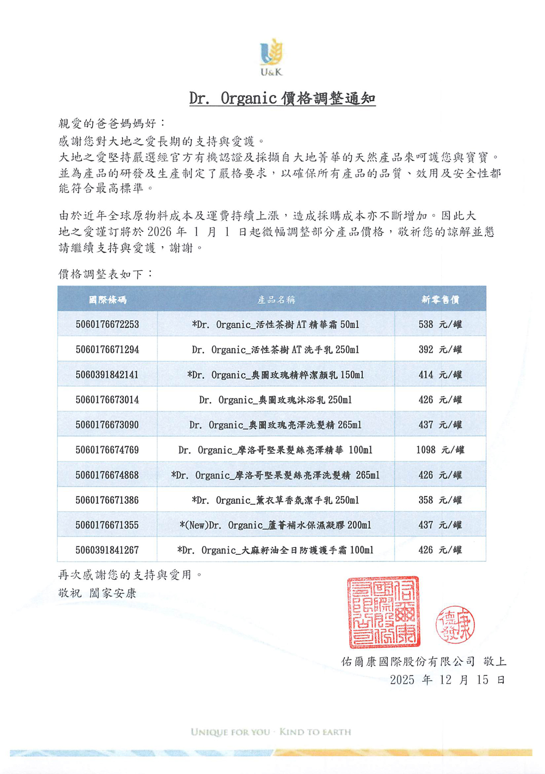 dr.organic 價格調價公告