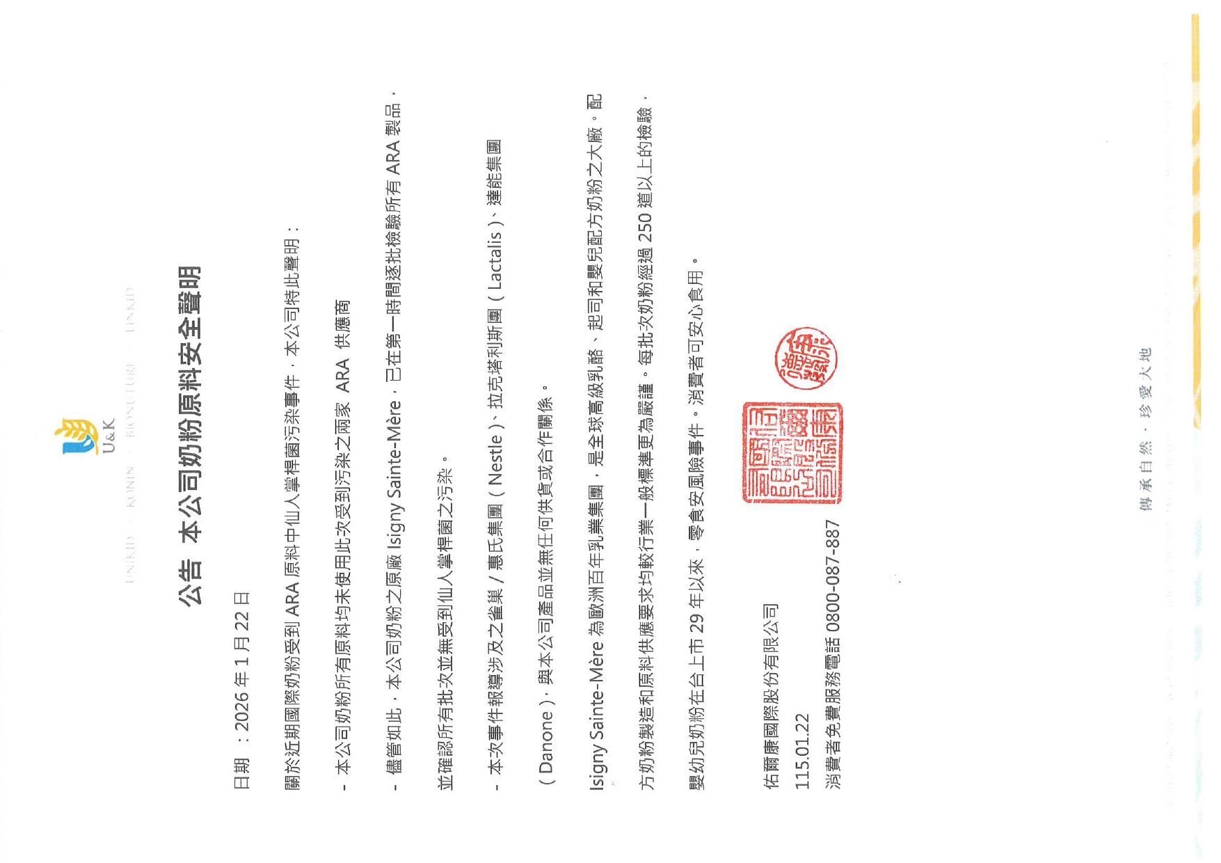 佑爾康 奶粉原料安全聲明