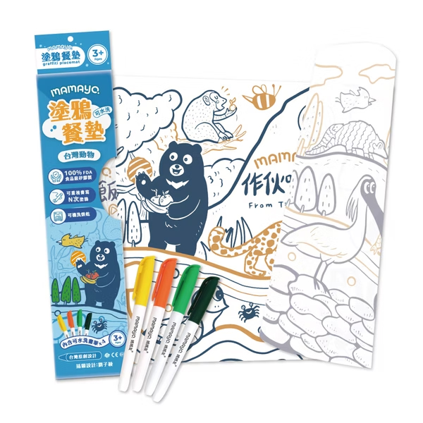 【全額Q兌】mamayo 可水洗塗鴉餐墊組-台灣動物(餐墊尺寸: 30*40cm)(120Q兌換)