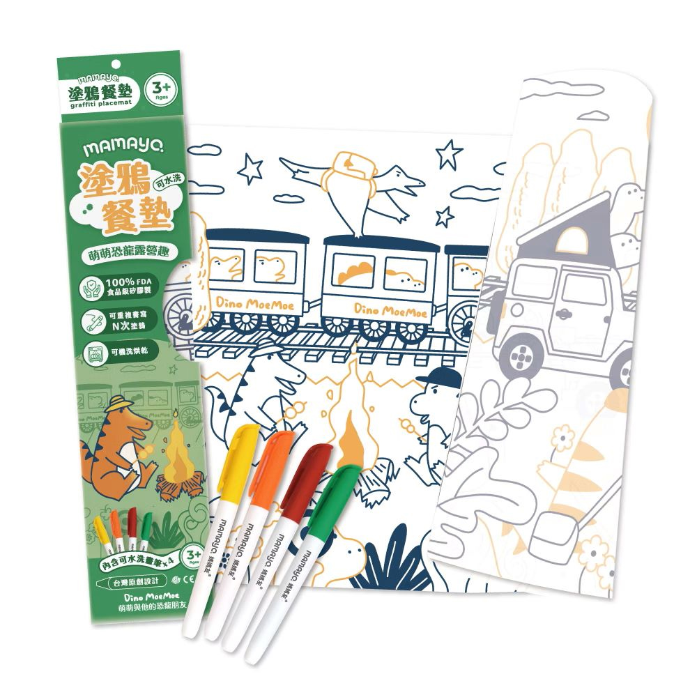 【全額Q兌】mamayo 可水洗塗鴉餐墊組-萌萌恐龍露營趣(插畫家元綺聯名款)(餐墊尺寸: 30*40cm)(120Q兌換)